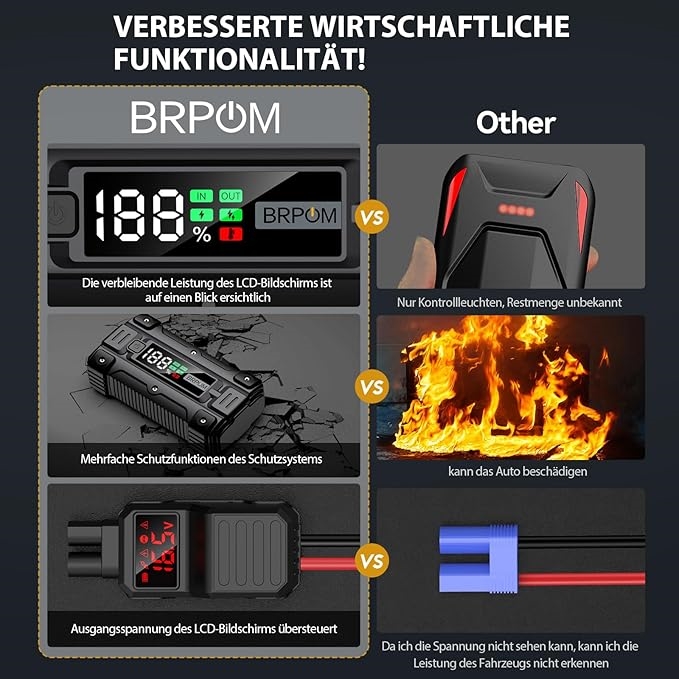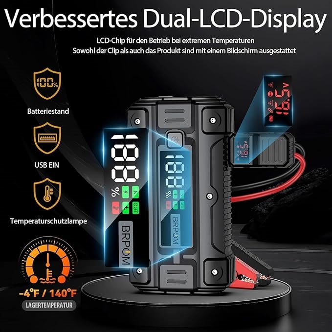 BRPOM leverer pålitelige løsninger for bilister som verdsetter beredskap og sikkerhet. Den oppgraderte kabelen med lengre og tykkere design forbedrer ledningsevnen, mens de 8 beskyttelsessystemene reduserer risikoen for skader ved feil bruk – spesielt verdifullt i ujevnt terreng eller under krevende forhold. Finn flere batteriladere og boostere i vårt sortiment.