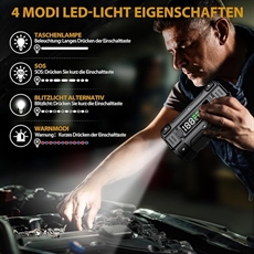 Ut over å starte din bil fungerer BM502 som en 26.800 mAh powerbank med 2 USB-utganger og 18W QC3.0, så du kan lade GPS, smartphones og andre enheter under reisen. 4 LED-moduser – belysning, stroboskop, SOS og advarsel – gir ekstra sikkerhet i mørke eller nødsituasjoner. LCD-skjermen viser tydelig batteristatus og driftsinformasjon, så du alltid vet om enheten er klar.
