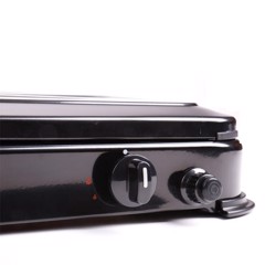 Kokeplaten måler 58 x 33 x 9 cm og har et gasstrykk på 30 mbar. To store brennere på hver 2200 watt (Ø 10 cm) og én mindre på 1850 watt (Ø 5,5 cm) gir deg fleksibilitet i matlagingen. Den avtakbare resten sikrer enkel rengjøring etter bruk.