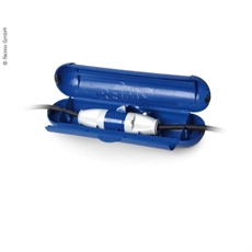 Blå sylinderformet enhet med "REIMO" på overflaten og synlig søm i midten.
