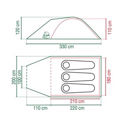 Teltet måler 330 x 200 x 120 cm og pakkes ned til 39 x 18 x 17 cm, hvilket gjør det enkelt å transportere i ryggsekk eller bil. Teltstengene er laget av aluminium 7001-T6 – et materiale som er både lett og sterkt, og som ikke ruster. Sømmene er tapede for å forhindre vanninntrengning og forlenge teltets levetid.