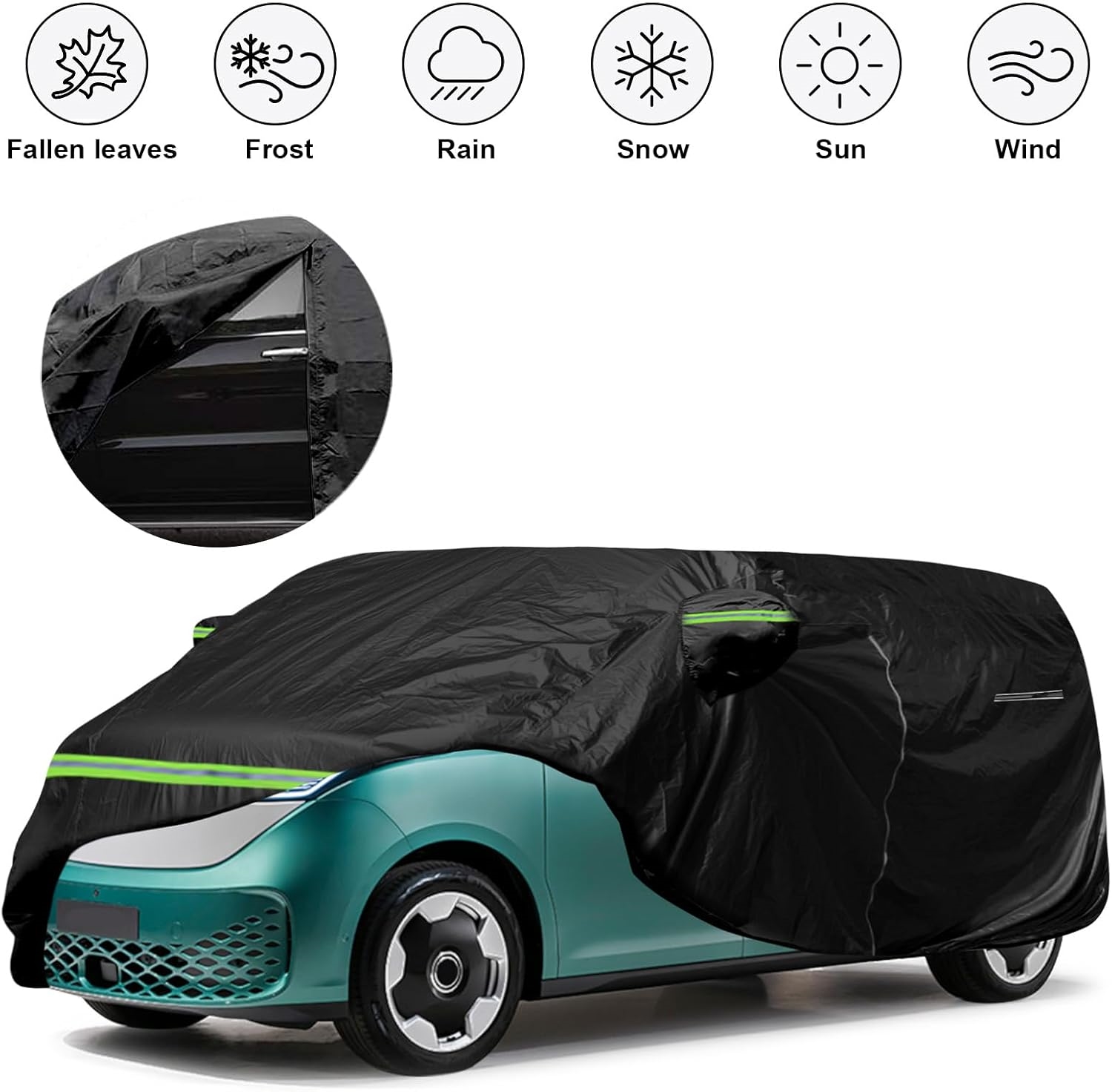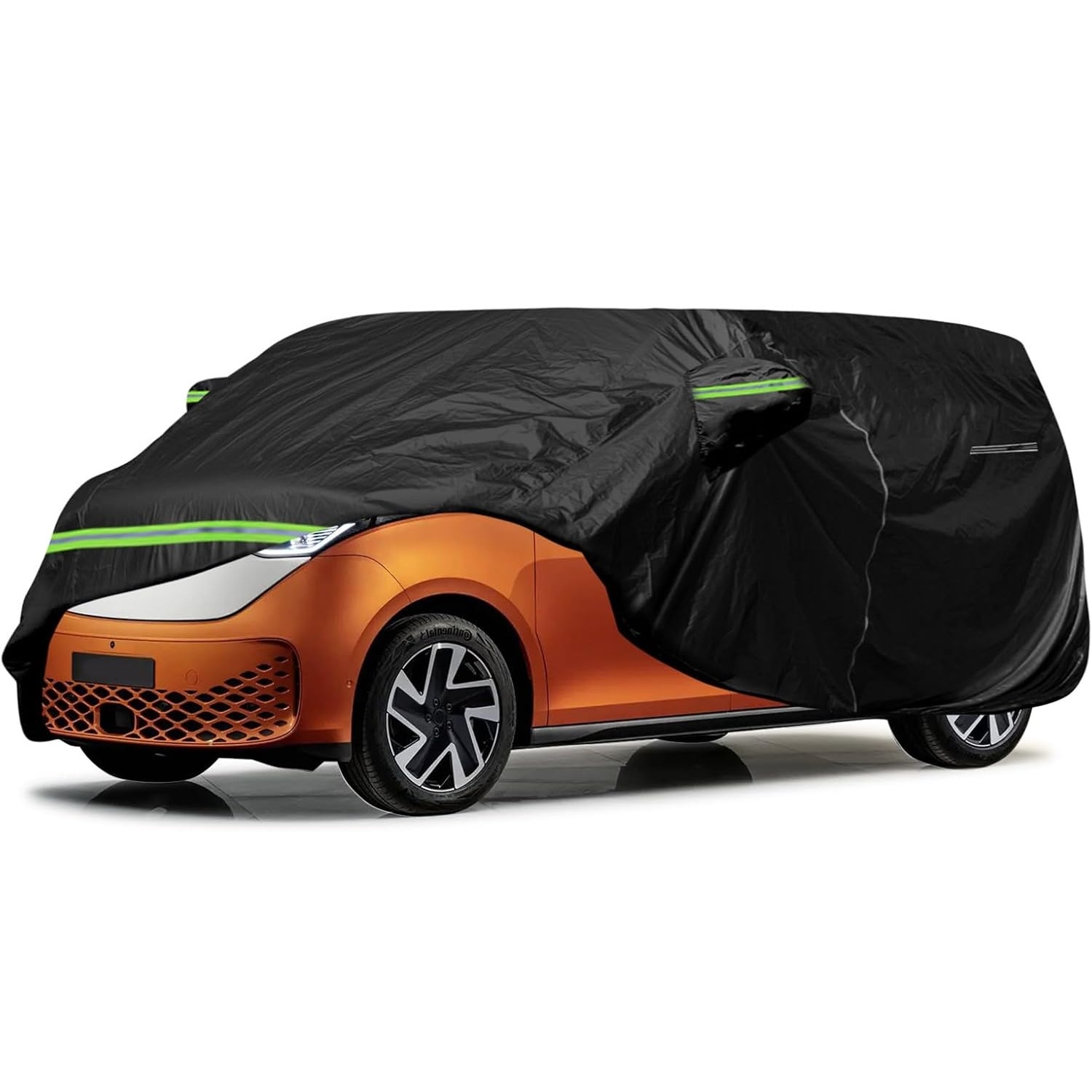 Coveret måler 185,5 x 78,5 x 76,5 tommer og passer nøyaktig til din ID. BUZZ. Elastiske sømmer i bunnen sikrer en stram passform, mens vindtette stropper på alle fire hjul holder coveret fast i blåsende vær – nyttig ved camping og skiturer. Speillommer beskytter sidespeilene, og justerbare elastiske sømmer lar deg finjustere passformen.