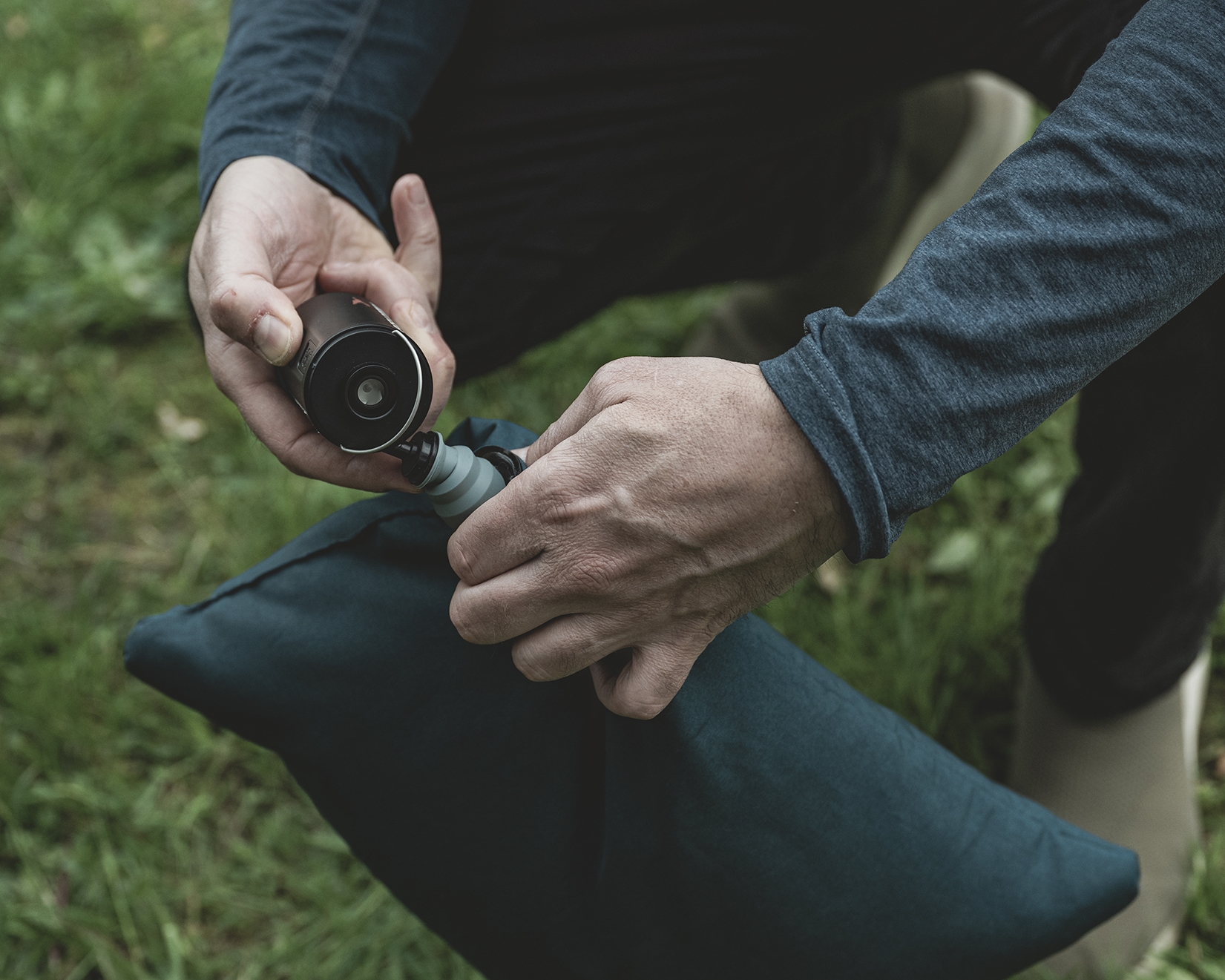 Den gjenoppladbare pumpen gjør oppblåsning av luftmadrasser og liggeunderlag rask og effektiv med en kapasitet på 180 l/min. Med en vekt på kun 67 g og kompakte mål på 7,1 x 4,6 x 5,0 cm opptar den nesten ingen plass i ryggsekken. Dobbeltfunksjonen betyr at du både kan pumpe opp og tømme utstyret ditt, noe som gjør nedpakking vesentlig raskere. Pumpen leveres med 5 forskjellige dyser, slik at den passer til campingutstyret ditt.