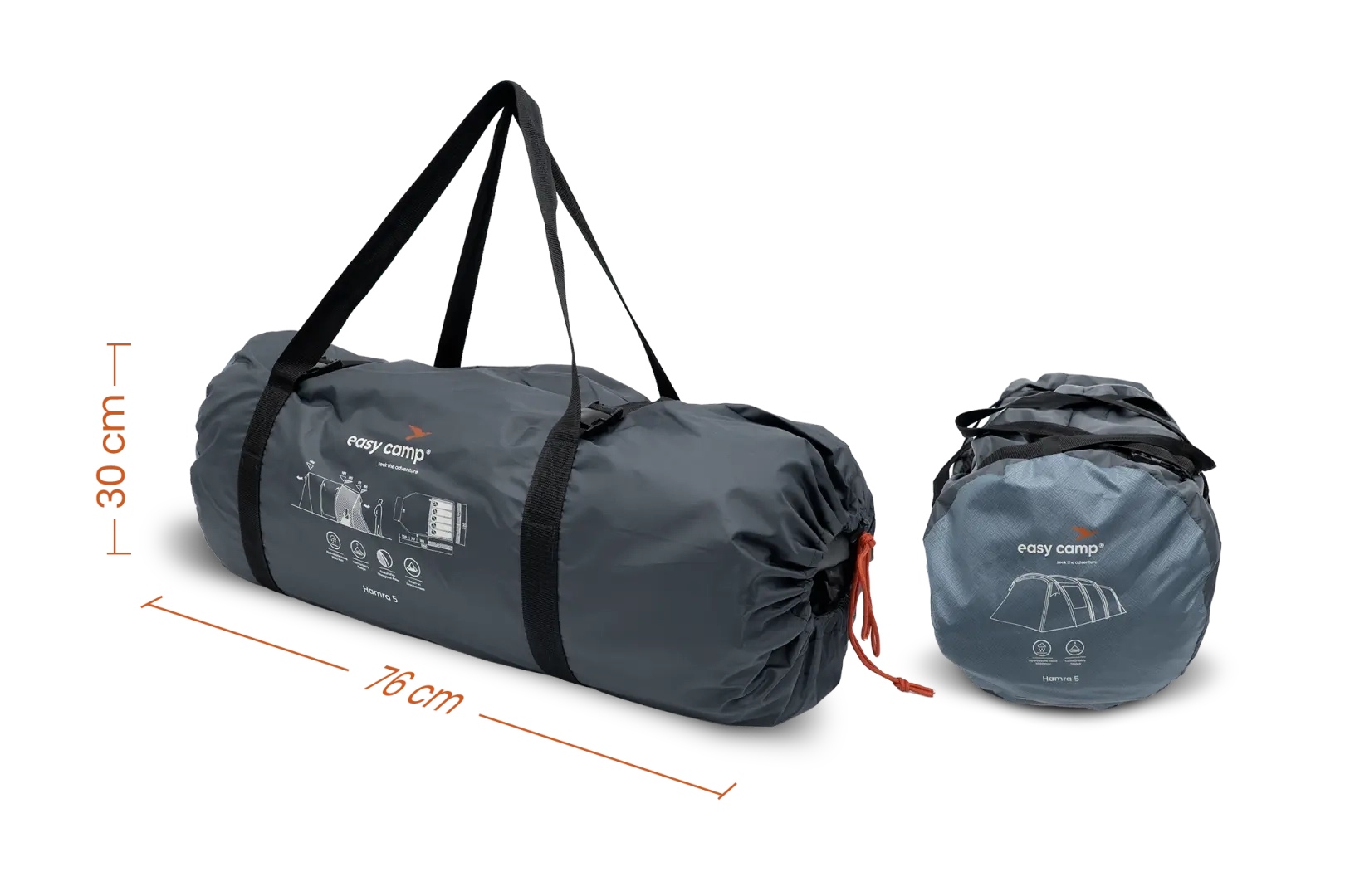 Easy Camp Hamra 5 kombinerer sikker værbeskyttelse med praktisk romfordeling for fem personer. Teltet har en vannsøyle på 3000 mm med tapede sømmer, som gir pålitelig beskyttelse mot regn. Bunnen er laget av dobbeltbelagt, vanntett polyetylen, som holder fuktighet ute fra underlaget. Med to separate soverom og et oppholdsrom med ståhøyde får familien både privatliv og bevegelsesfrihet. Monteringstiden er 16 minutter komplett eller 9 minutter til innflytting, noe som gir mer tid til selve campingturen. Teltet veier 16,5 kg og har en pakket størrelse på 76 x 30 cm, så det kan transporteres uten å fylle hele bagasjerommet. Konstruksjonen med EnduraFlex glassfiberstenger på 12,7 mm sikrer god stabilitet, mens det pustende polyesterteltet forhindrer kondensdannelse.