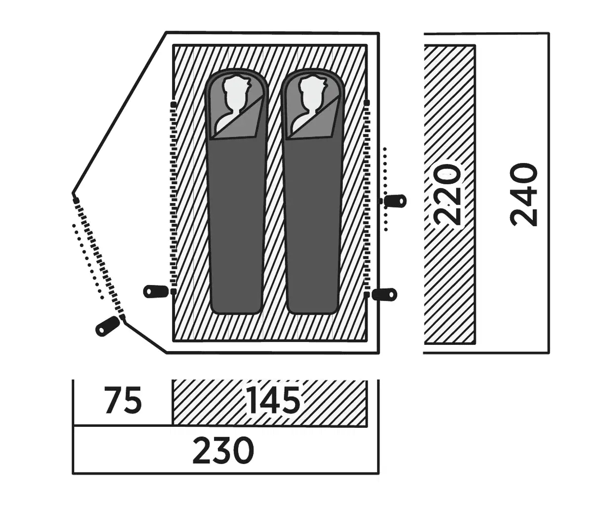 Under lange vandreturer blir hver ekstra kilo i ryggsekken en belastning. Vekten på 2,7 kg gjør det mulig å pakke mer proviant eller spare energi i oppoverbakker. Den kompakte pakkestørrelsen på 40 x 13 cm passer lett i eller på ryggsekken eller på sykkelen uten å ta unødvendig plass. Når været skifter uventet i fjellet, beskytter vanntettheten på 3000/5000 mm mot regn og holder deg tørr gjennom natten. Etter en lang dagstur er oppsettetiden på 3-4 minutter en fordel, slik at du raskt kan få ly og hvile.