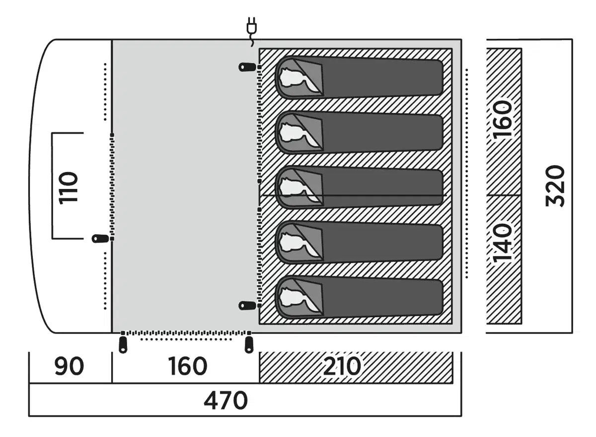 Tunnelkonstruksjonen gir ekstra plass og skaper en hjemlig atmosfære under campingturen. De to soverommene og oppholdsrommet sikrer at familien både har privatliv og et felles område å samles i. Ståhøyden på 195 cm betyr at voksne kan bevege seg rundt uten å måtte bøye seg, hvilket gjør lengre opphold langt mer komfortable. Kombinasjonen av romslig innredning og praktisk funksjonalitet gjør Skarvan 5 velegnet for familier som ønsker både plass og komfort på campingplassen.