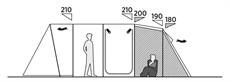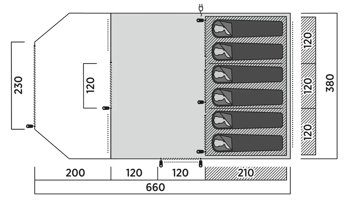 Teltets romdeling gir tre separate soveavlukker og en romslig stue med ståhøyde. Den avtakbare soveromskiller kan justeres etter behov for ekstra privatliv eller åpne rom. Overdekket forrom gir plass til oppbevaring av sølete støvler, vått utstyr, møbler og kjøkkenbord. Inngangsdøren har et fullt insektbeskyttende nett, mens sideinngangen har en full nettdør for sikker ventilasjon uten at insekter kommer inn. Front- og sidedører er utstyrt med to glidelåser for fleksible dørkonfigurasjoner. Mesh-paneler på begge sider av inngangen til stuen sikrer god luftcirkulasjon. Organiseringslommer i stueområdet og innteltet holder småting organisert.