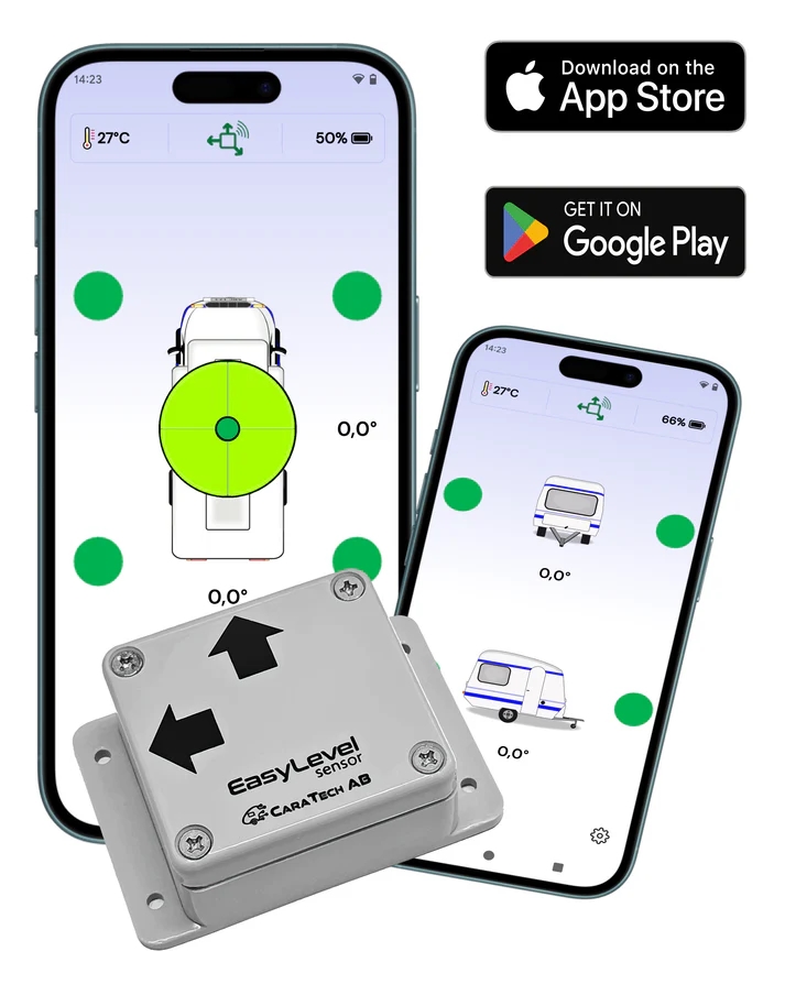 EasyLevel leverer pålitelige løsninger for presis nivellering av campingvogner og bobiler så du alene kan manøvrere vognen på plass. Den samme sensoren fungerer med begge app-versjoner, så du kan bytte mellom dem uten ekstra kostnader. Hvis du reiser ofte, sparer permanent montering deg for tid ved hver destinasjon – vateret er alltid klart til bruk.