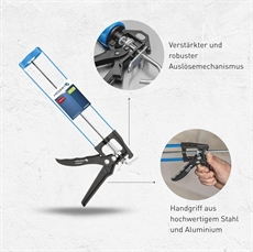 Fugepistol i kraftig kvalitet er fremstilt av sort og blålakkert stål, hvilket gir beskyttelse mot rust og værpåvirkninger ved utendørs arbeid. Designet for standard fugepatroner på 310 ml sikrer kompatibilitet med vanlige patroner. Den trinnløse funksjonen for presis påføring gir full kontroll over fugemassens flyt, slik at du kan tilpasse hastigheten etter oppgavens krav - langsom og presis til detaljarbeid eller raskere til større flater.