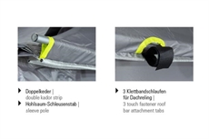 • Monteringsmuligheter til vognen: i teltløp, til rails, barduner over taket eller sugekopp på taket