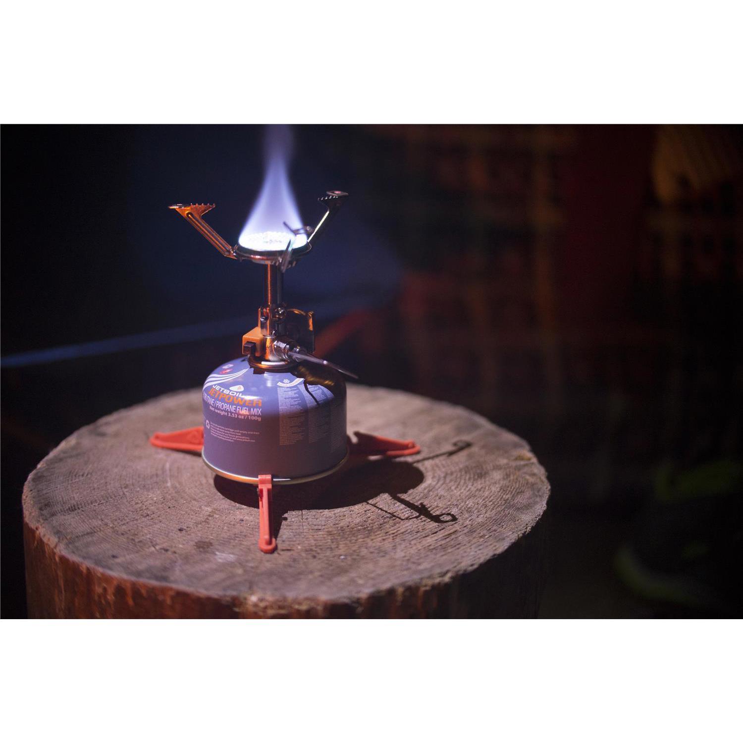 Med en vekt på kun 95 gram er JETBOIL MightyMo Brenner den ideelle lettvektsløsningen for dine utendørseventyr. Den kraftige 3.000 watts brenneren koker en liter vann i en gryte med FluxRing på 180 sekunder, noe som sparer både tid og brensel på turene. Takket være den pålitelige piezotenningen starter brenneren med et trykk på knappen, selv i kaldt vær ned til -6 grader. Trykkregulatoren sikrer en stabil flamme under alle forhold, og de medfølgende støttebeina til gassboksen gir solid stabilitet til kokeutstyret ditt. Med et brenselforbruk på 12 liter vann per 100 g gass får du maksimal utnyttelse av gassboksen din (EN 417).