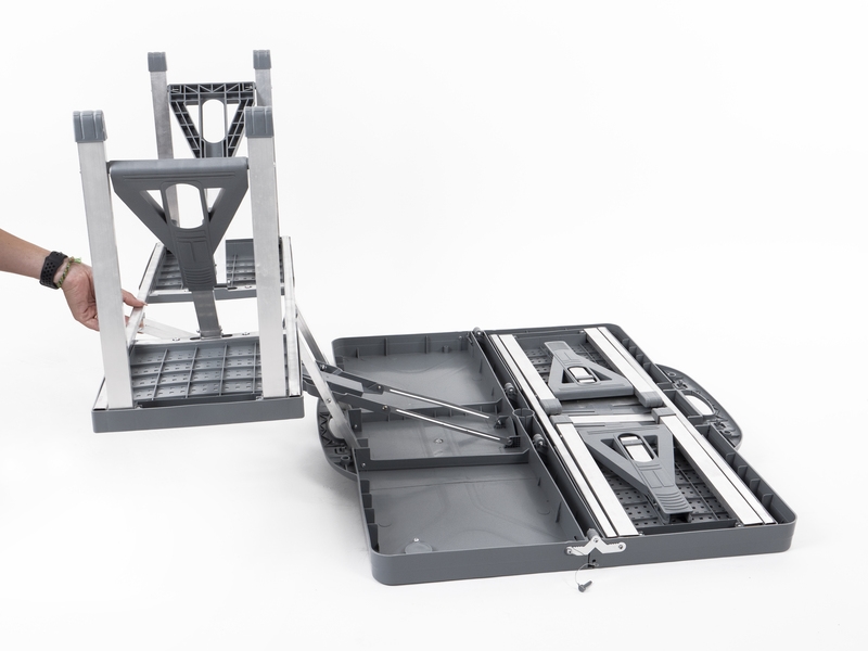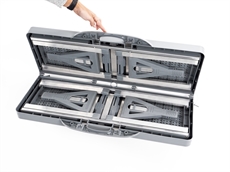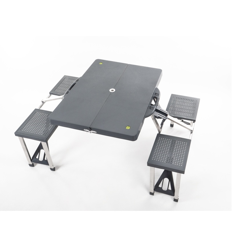 Dette picnicbord foldes sammen på midten og har et praktisk bærehåndtak, slik at du kan transportere det som en koffert til campingplassen eller picnicstedet. De fire fast installerte setene betyr at du ikke trenger å ha med separate stoler – brett ut bordet, og det er klart til bruk. Med en vekt på 6,5 kg kan du lett bære det fra bilen, mens pakkestørrelsen på 65 x 85 x 11 cm gjør det enkelt å oppbevare i bagasjerommet eller campingvognen.