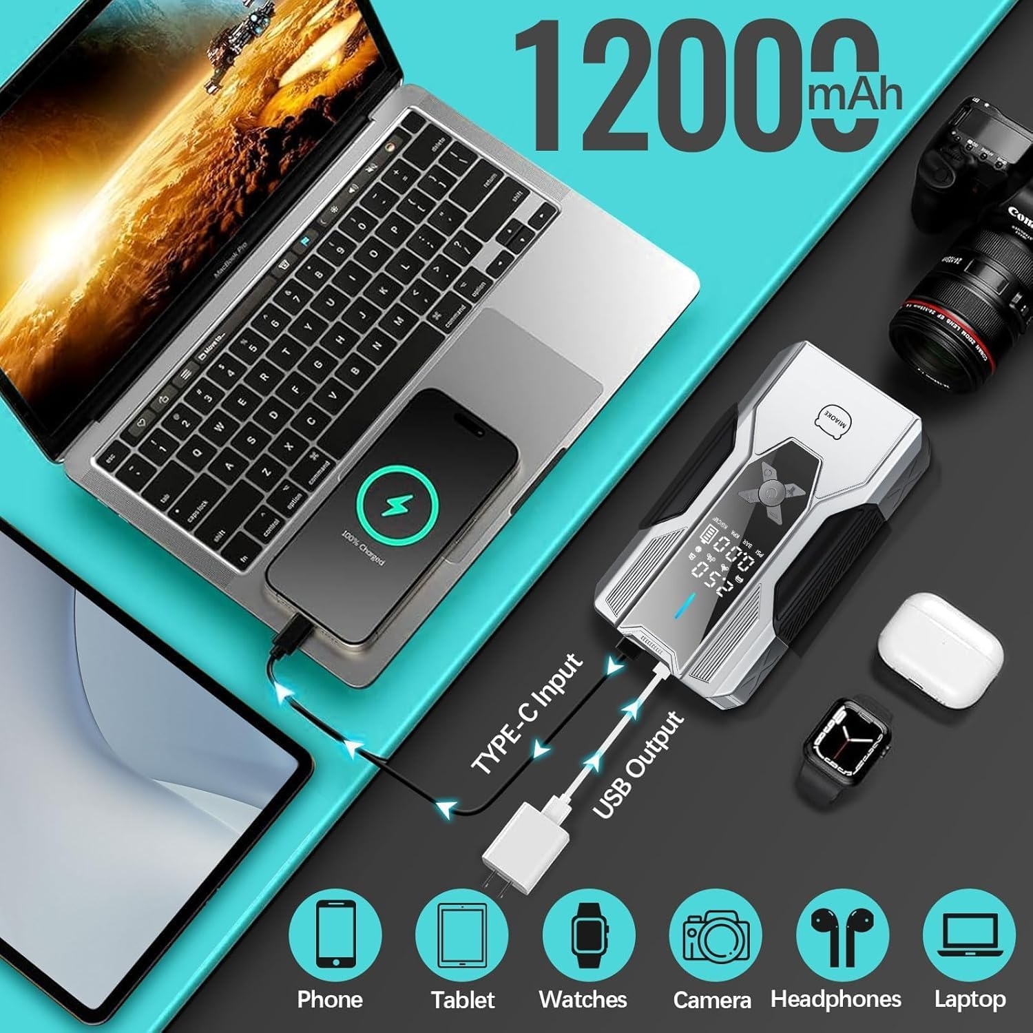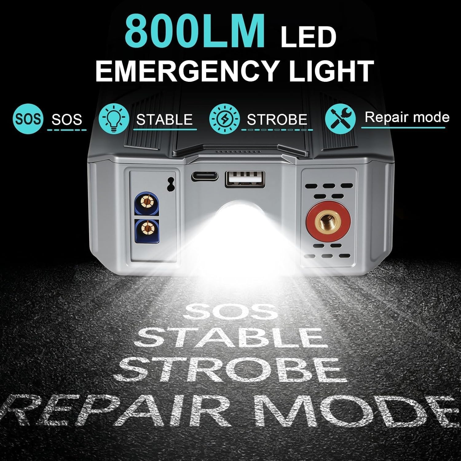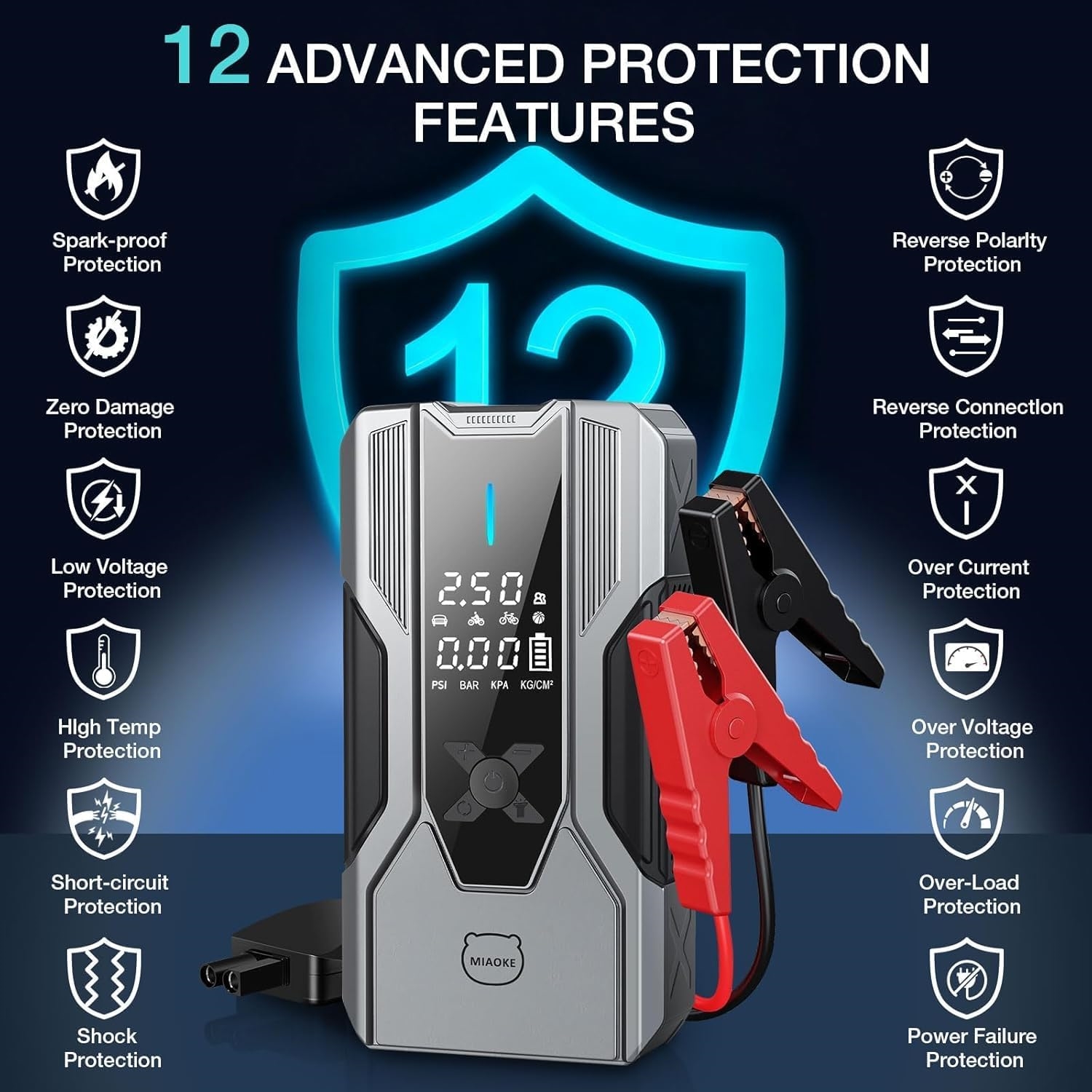 Hvis du har stått med et tomt batteri på en kald morgen eller lavt dekktrykk før jobb, vet du hvor frustrerende det kan være. MIAOKE 8000A leverer 8000A spissstrøm, så du kan starte både bensin- og dieselmotorer i biler og lastebiler. Luftkompressoren på 150 PSI pumper dekk opp fra 2,0 bar til 2,5 bar på 90 sekunder, noe som sparer tid ved veikanten. AI-smart brikke med 12 batteribeskyttelsessystemer sikrer mot feil bruk.
