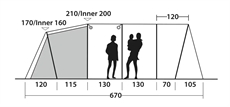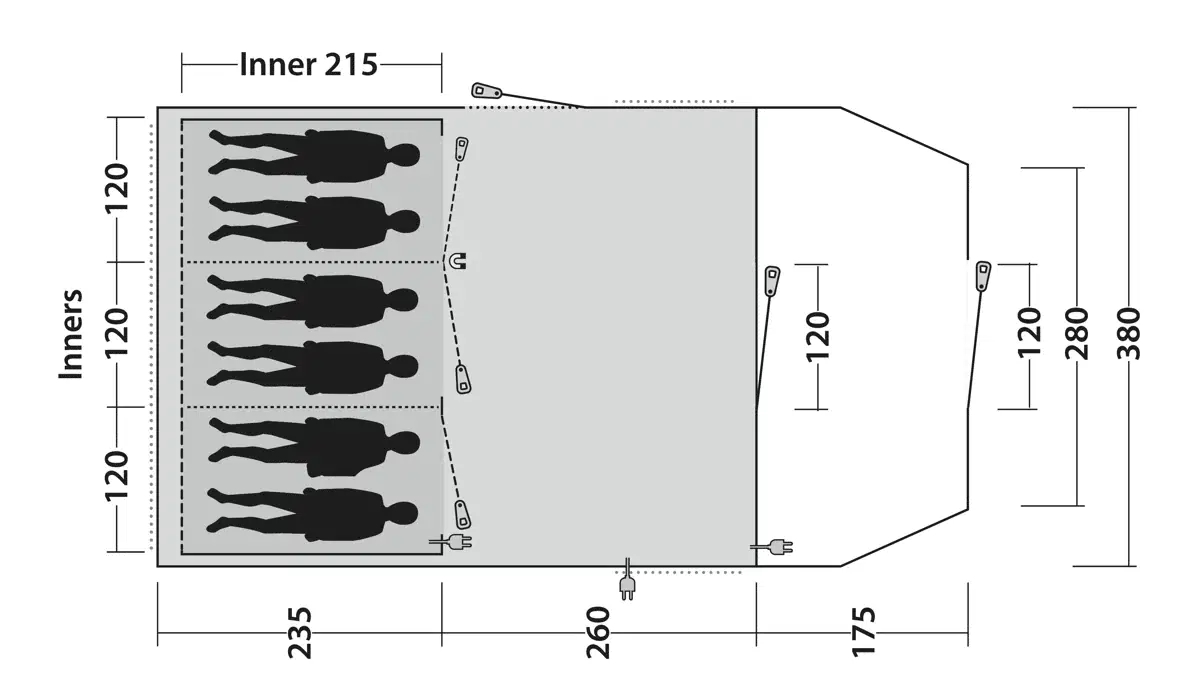 Forrom, oppholdsrom og soveavdeling fungerer som separate områder som imøtekommer forskjellige behov. Forrommet gir plass til oppbevaring av våte klær, sko, sparkesykler m.m. og møbler uten å bringe skitt inn i oppholdsrommet. Oppholdsrommet fungerer som fellesområde, hvor familien kan spise og oppholde seg, mens de to sovekabiner gir privatliv til barn og voksne. Denne inndelingen reduserer rot og skaper struktur i hverdagen på campingplassen. Det integrerte Outwell Light System med justerbart lys gjør det enkelt å navigere mellom sonene etter mørkets frembrudd. Flere oppbevaringslommer er integrert i teltet for å holde styr på småting.