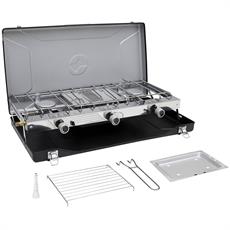 Med tre separate brennere får du et allsidig utendørskjøkken som kan håndtere matlaging for 4-6 personer. Hver brenner yter 1500W og gir deg presis kontroll over varmen til ulike retter samtidig. De individuelle kontrollknappene i holdbar sinklegering sikrer full kontroll over matlagingen, mens den medfølgende grillristen og dryppbrettet utvider dine tilberedningsmuligheter. Den midterste brenneren er spesielt godt egnet til grilling, og med en koketid på 8:07 minutter per liter vann kan du raskt komme i gang med matlagingen. Gassblusset er designet med fokus på stabilitet gjennom antiskli gummiføtter, og den automatiske piezo-tenningen sikrer pålitelig start i all slags vær. Vindbeskyttelsen på siden holder flammen stabil, og brenntiden på 55 minutter per 100 g gass gir deg god tid til matlagingen. Den sammenleggbare konstruksjonen reduserer transportvolumet med 40%, noe som gjør det enkelt å ta med på lengre campingturer. Tilkoblingen til standard LPG gassflasker er sikker og enkel å håndtere.