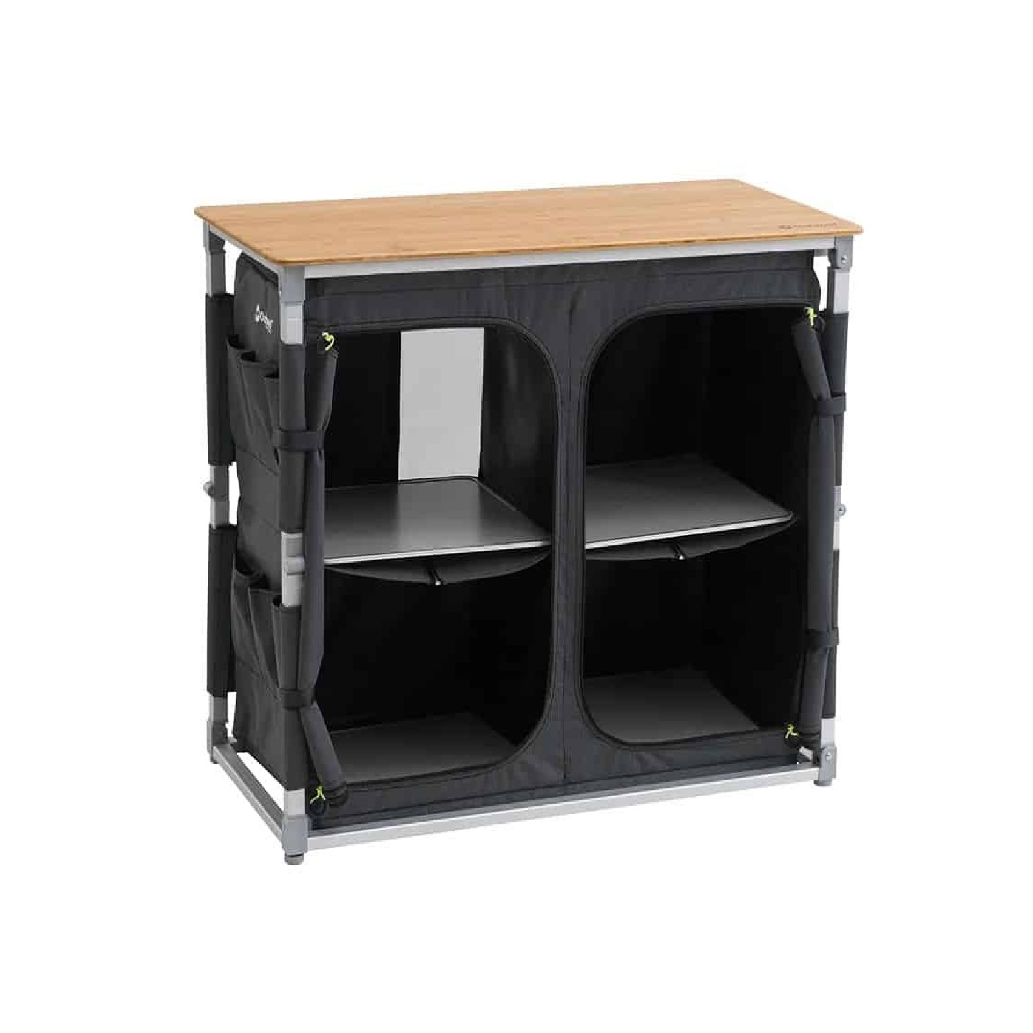 Dette praktiske oppbevaringsskapet åpnes og brettes på få sekunder, noe som gjør det ideelt for campinglivet. Med to hovedrom, seks oppbevaringslommer og en robust bambusplate på toppen får du en effektiv oppbevaringsløsning. Skapet er utstyrt med nett for luftsirkulasjon, som forebygger fuktighet og lukt, samt en uttrekkbar holder for oppvaskbalje. Du kan bl.a. bruke bordplaten til kjøkkenbord og evt. til en gassbrenner.