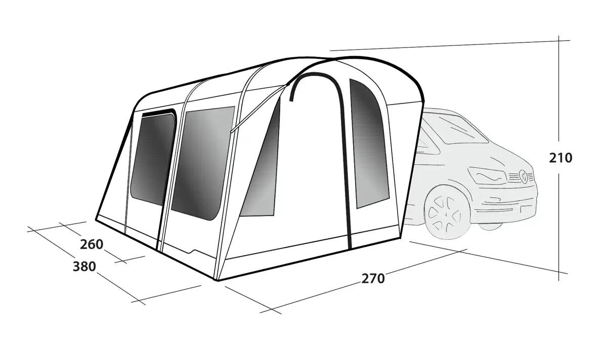 OUTWELL Oppdaterte Wolfburg Air Drive-Away Bustelt gir camper-eiere mulighet til å forlate campingplassen i kjøretøyet uten å måtte demontere hele oppsettet. Teltet festes til bobilen og kan stå igjen som basecamp under dagsturer. Dette luftteltet med Rigid Air Systemet reduserer oppsettstiden betydelig sammenlignet med tradisjonelle stangkonstruksjoner, mens vannsøyletrykket på 3.000 mm sikrer vanntett beskyttelse mot regn. Teltet passer til kjøretøy med tilkoblingshøyde mellom 175-200 cm og en taktilkoblingslengde på 250 cm. Den inkluderte pumpen, pluggene, reparasjonssettet, krokene og ekstra barduner betyr at alt nødvendig utstyr følger med fra start. Ytterteltet i Outtex 3000 Select polyester og innsydde bunnseil av dobbeltbelagt polyetylen gir holdbar værbeskyttelse gjennom flere sesonger. Kan monteres direkte i teltsskinne 5 eller 7 mm. Eller via magnetadapter som tilkjøp, feste i rails, eller med barduner over bilens tak.