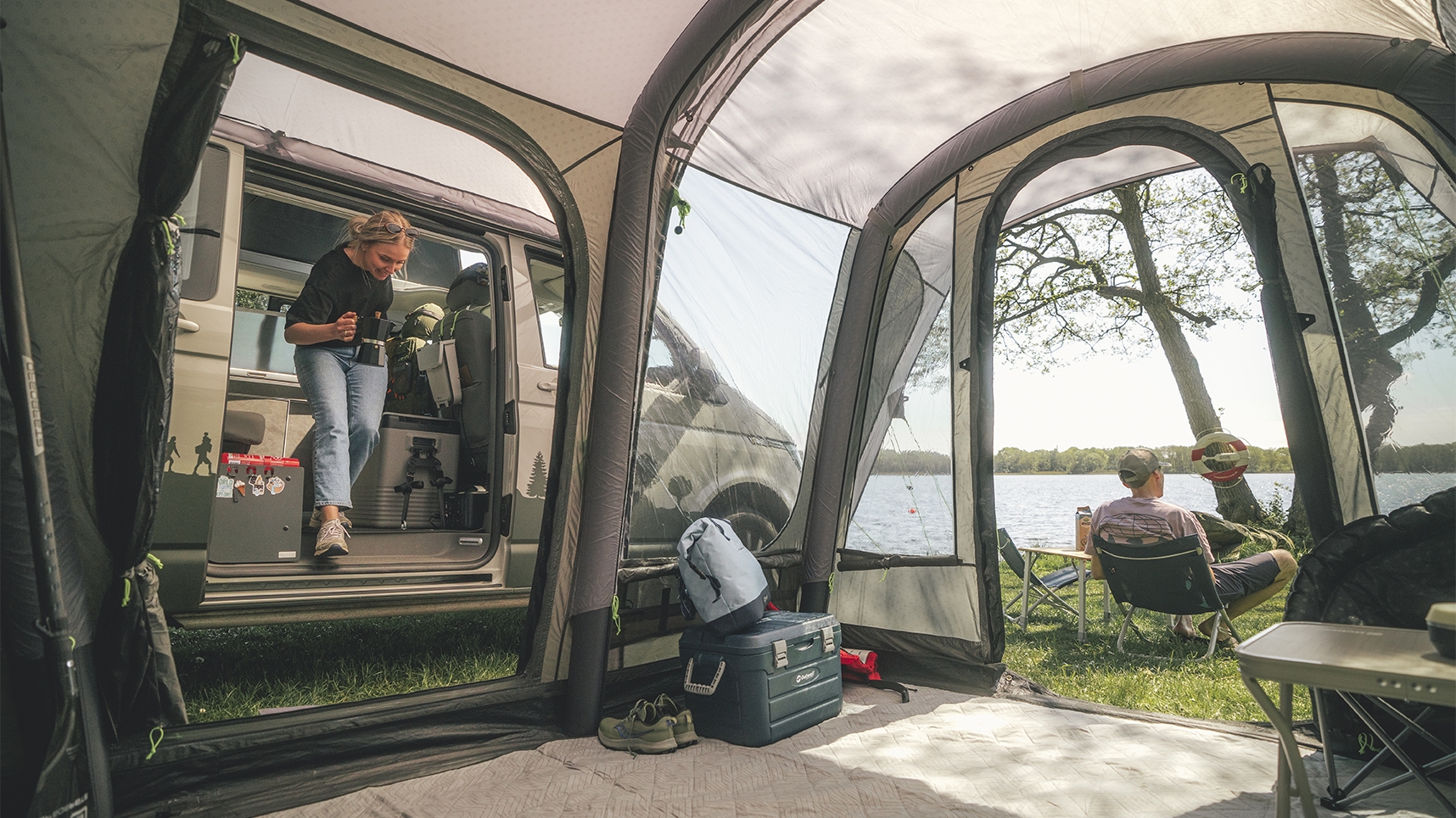 Mange camper-eiere opplever at tradisjonelle telt med stangkonstruksjoner tar lang tid å sette opp og ned ved hyppige forflytninger. Utilstrekkelig ventilasjon skaper kondensproblemer ved lengre opphold, mens manglende kompatibilitet mellom telt og kjøretøy fører til lekkasjer ved tilkoblingen. Wolfburg Air løser disse problemene med rask oppblåsing, to store sidedører med insektbeskyttende mesh for gjennomgående luftsirkulasjon og presise tilkoblingsmål som sikrer tett forbindelse til bobilen.
