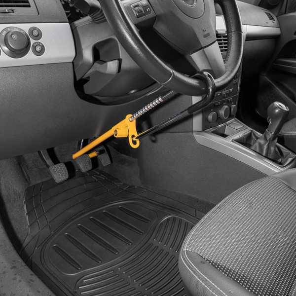 Solid rattlås fra ProPlus. Rattlåsen monteres på rattet i den ene enden og ned om bremsepedalen med den anden enden.