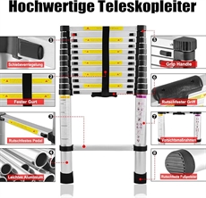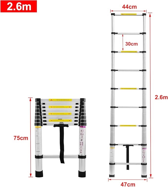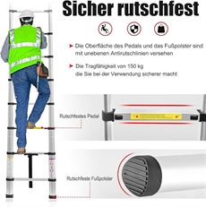 Denne teleskopstigen gir deg sikker tilgang til høyder opp til 2,6 meter, mens den kun måler 0,75 meter sammenfoldet. Med 9 trinn kan du justere nøyaktig til den høyden du trenger - om det er til bobil, campingvogn eller hjemme. Hvert trinn låses automatisk, så stigen ikke kan foldes sammen utilsiktet under bruk. Aluminiumskonstruksjonen er rustfri og tåler 150 kg, noe som gir plass til deg og ditt verktøy.
