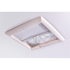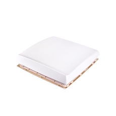 Hvit takluke med vifte, lav profil, ideell for campingvogner eller bobiler.