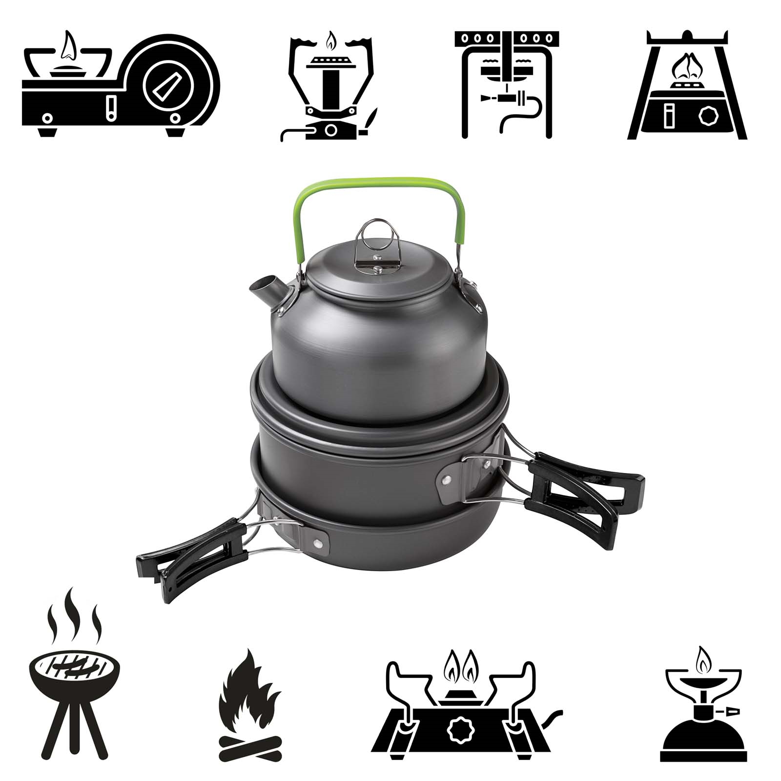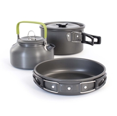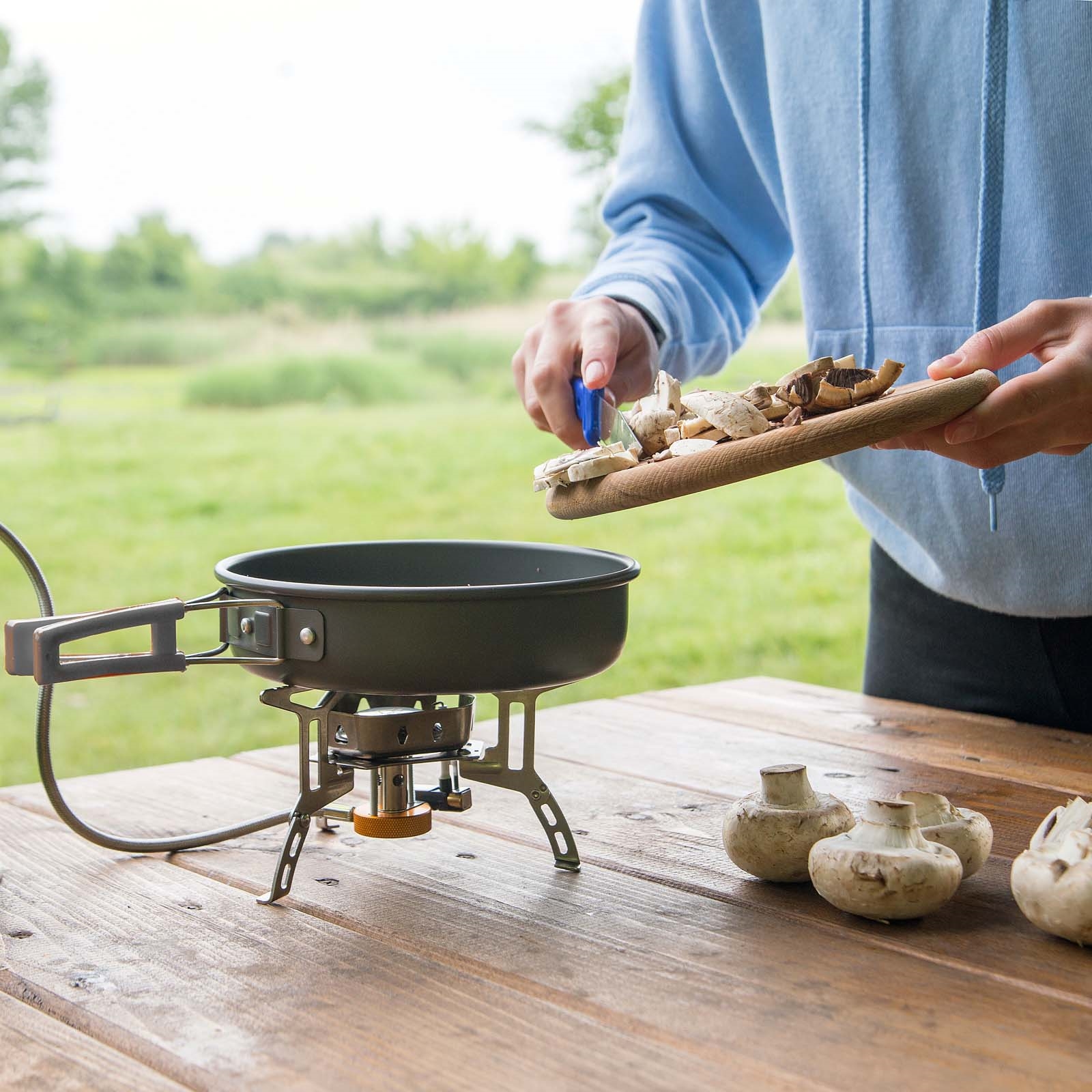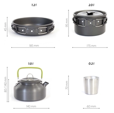 Dette komplette grytesettet gir deg alt nødvendig til både daglig matlaging hjemme og campingturer. Settet transporteres enkelt i en bæretaske med karabinkrok, slik at alle deler holdes samlet og beskyttet. Med en 2,0 liters gryte og en 0,8 liters kjele kan du tilberede måltider til to personer, mens den skrue-på-komfyr med justerbar flammekontroll gir fleksibilitet til matlaging ulike steder.