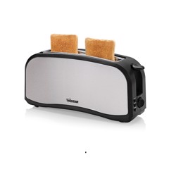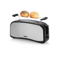 Brødrister i rustfritt stål med lang åpning slik at det er plass til to brød. Med brødristeren følger et stativ som du kan varme boller på. Termostat med 6 innstillinger, avrimingsfunksjon, gjenoppvarmingsfunksjon, avbruddsfunksjon, automatisk pop-up funksjon og avtagbart smulebrett.