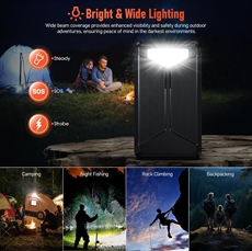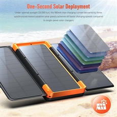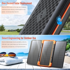 Powerbanken sikrer langvarig strømforsyning i flere dager når du ikke har tilgang til strømnettet. Solcellepanelene gjør deg uavhengig av tradisjonelle strømkilder i naturen. LED-nødbelysningen gir trygghet i mørke omgivelser med tre innstillinger: SOS, stroboskop og kontinuerlig lys. Trådløs lading på opptil 15 W gjør det enkelt å holde enheter ladet uten kabler i trange rom.