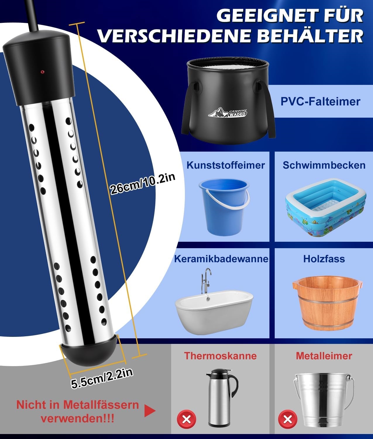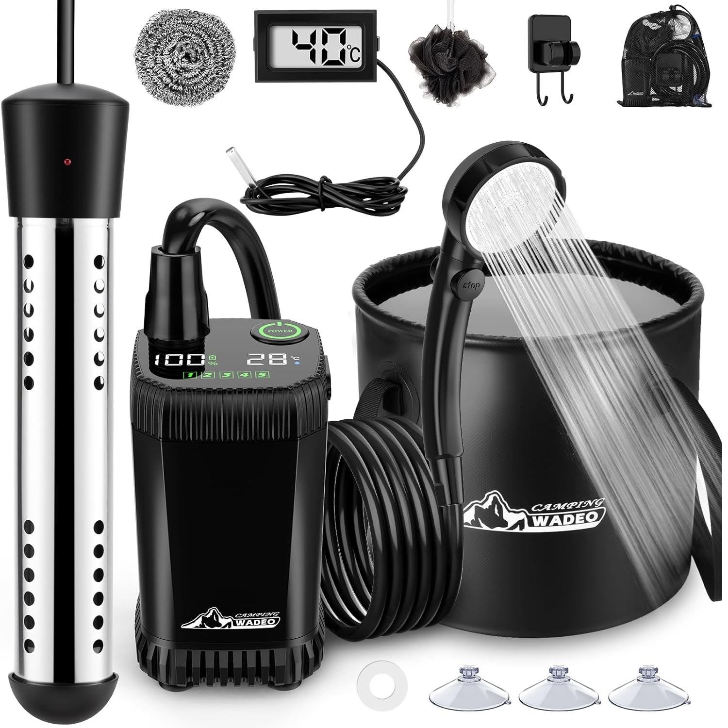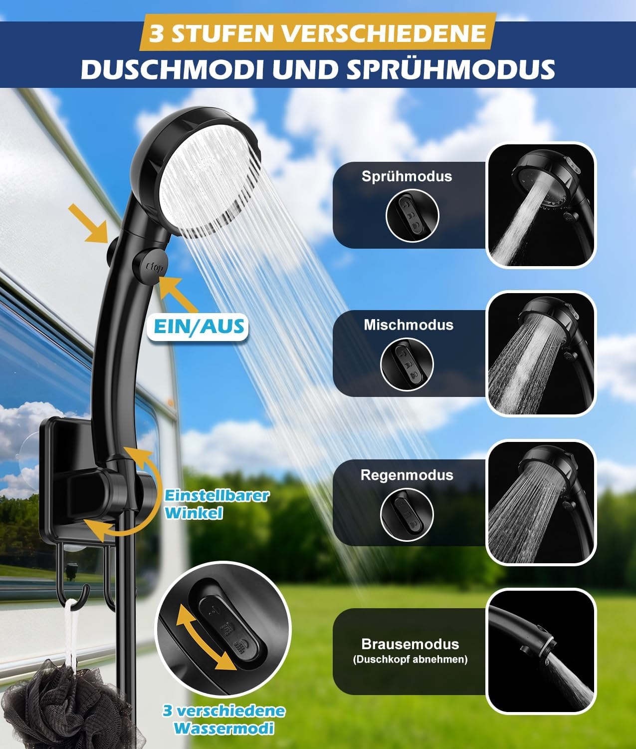 Denne campingdusjen kombinerer en dykkpumpe, massasjedusjhode, sammenleggbar 20-liters bøtte og vannvarmer i én kompakt løsning. Den automatiske termostaten slår seg av ved 70 °C og på igjen ved 40 °C, slik at du får varmt vann uten konstant overvåkning – ideell når du camperer i naturen. Med 5 justerbare gjennomstrømningsmodi får du kontroll over vannforbruket: modus 1 gir 140 minutters driftstid, mens modus 5 gir 80 minutter.