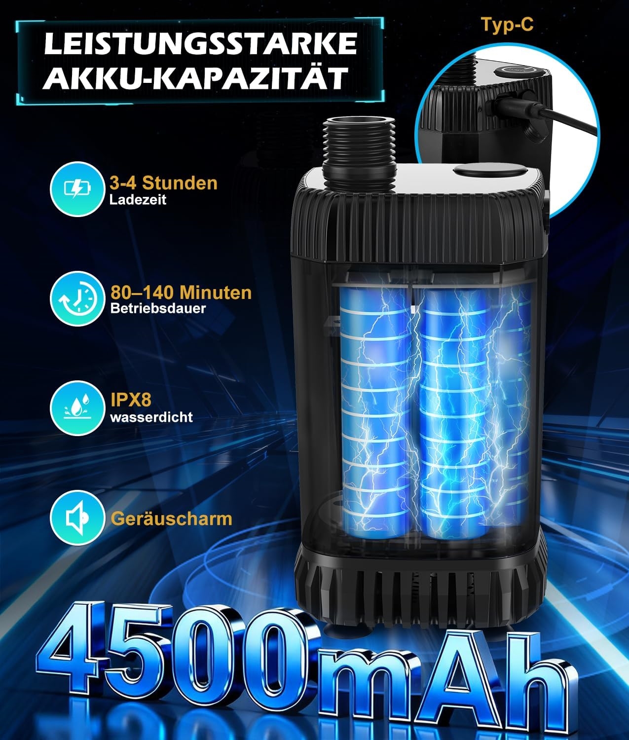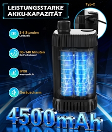 • Ladetid vannpumpe: 3-4 timer med 5V/2A-lader
