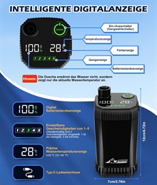 Laget av rustfritt stål 201 og tykke kobberledninger sikrer konstruksjonen holdbarhet under utendørs forhold. LED-displayet viser batteristatus og valgt dusjmodus i sanntid, slik at du kan planlegge bruken. Dusjhodet har 3 stråletyper og vannpausefunksjon – fjern hodet for intensivstrålemodus for å skylle salt og sand av etter stranden. 3-i-1 krok gir fleksibel montering på campingvogner eller biler.