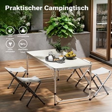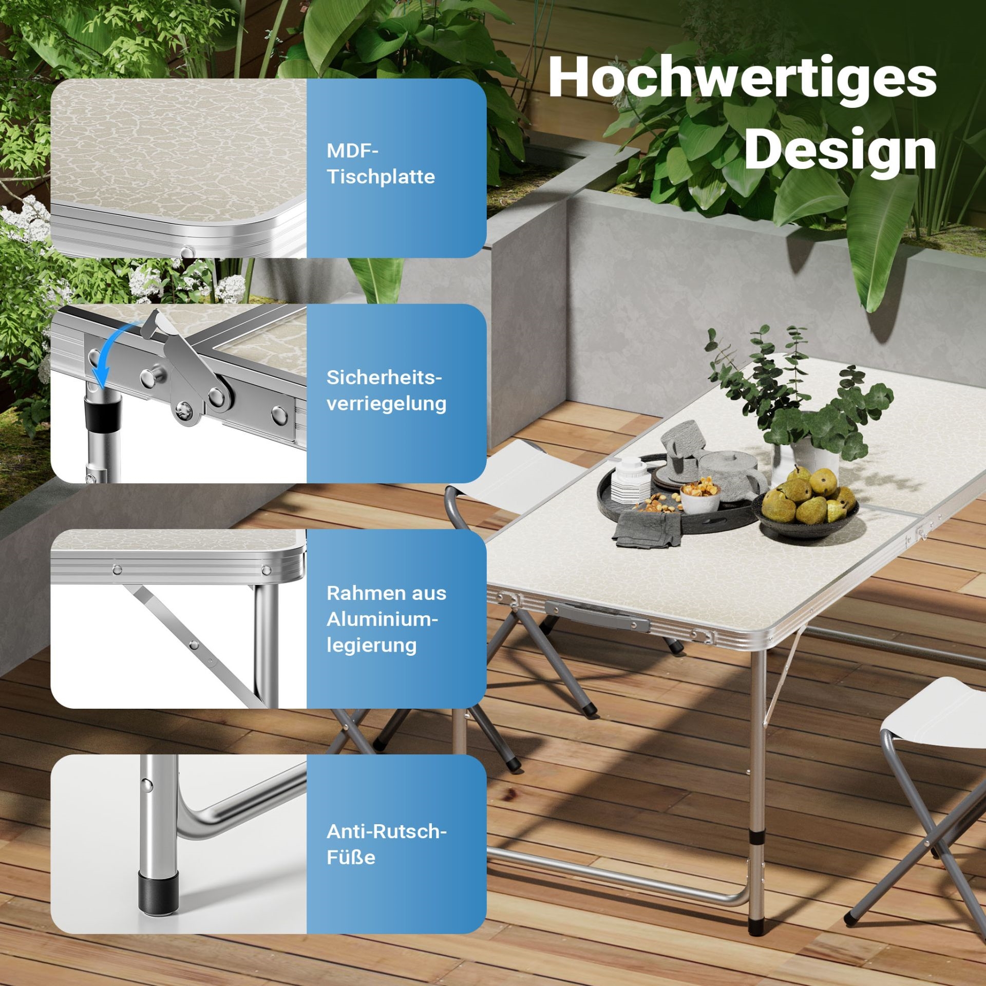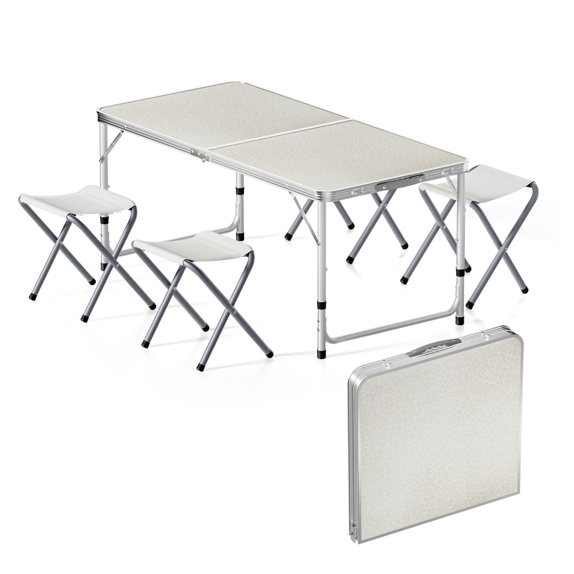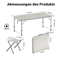 Dette campingsettet foldes sammen for enkel transport og oppbevaring, noe som gjør det praktisk for telturer og strandutflukter. Med en totalvekt på bare 6 kg kan du enkelt bære det i bil eller campingvogn. Bordhøyden justeres til 54 cm, 61 cm, eller 70 cm, slik at du kan tilpasse det til ulike terreng og behov – fra matlaging til spising. Settet gir plass til 4 personer med en bordplate på 120 x 60 cm.