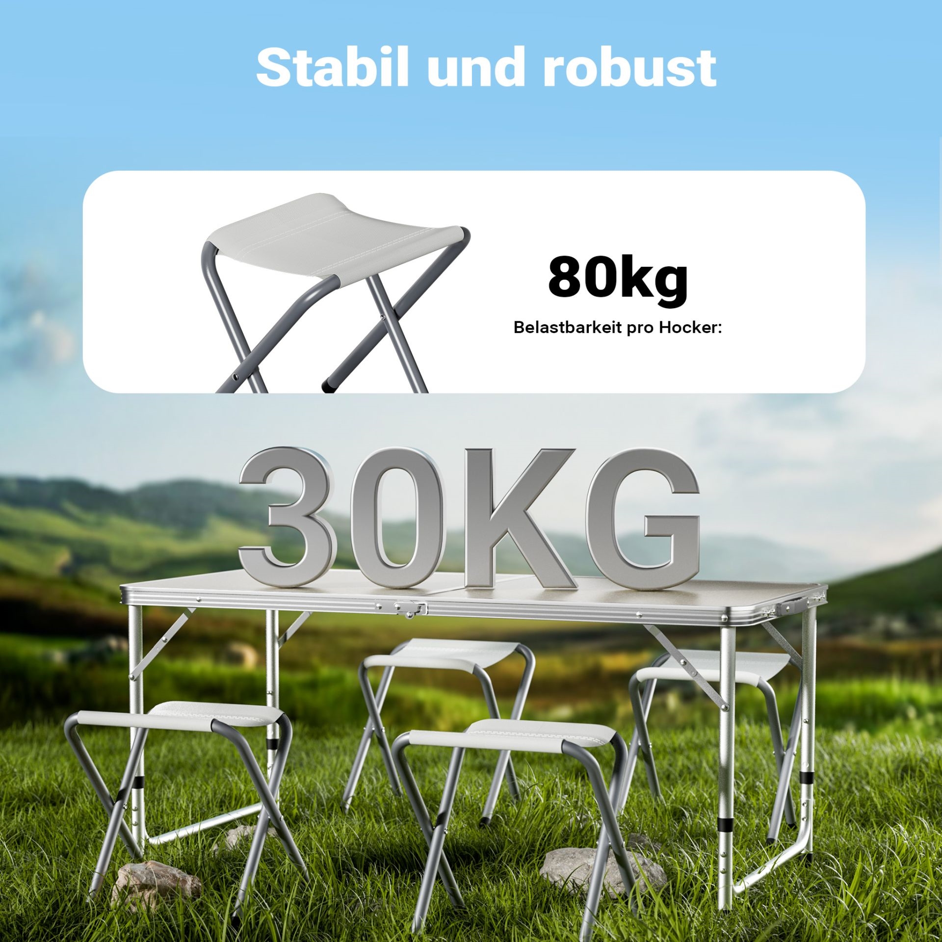 WILTEC leverer funksjonelt campingutstyr for utendørs aktiviteter. Dette settet sikrer stabilitet med en kapasitet på 80 kg per krakk, mens den justerbare høyden gir fleksibilitet til ulike situasjoner. MDF-bordplaten er robust for utendørs bruk og lett å rengjøre etter bruk. Finn flere campingbord i vårt sortiment.